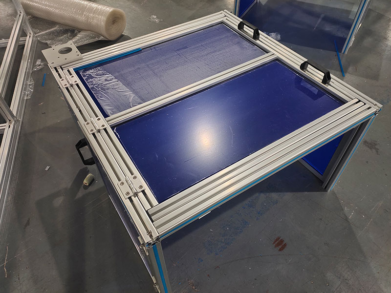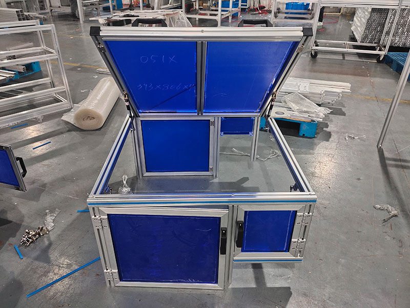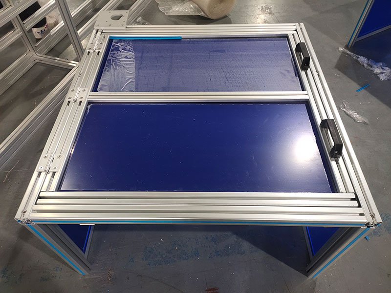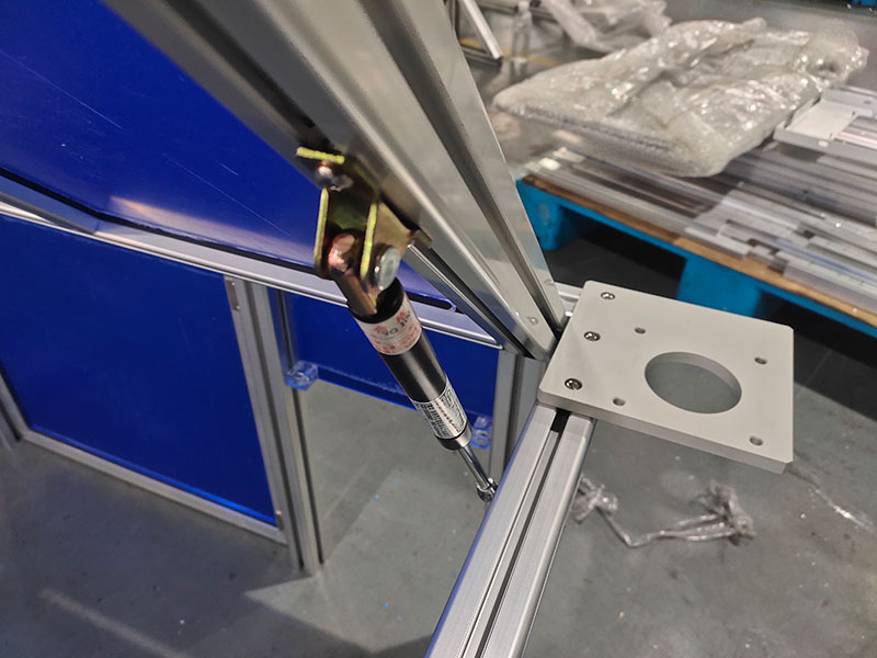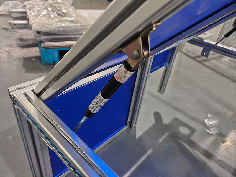 這個(gè)鋁型材設(shè)備防護(hù)罩頂部蓋板可以打開一個(gè)角度并固定住,也可以輕輕蓋上。實(shí)現(xiàn)這一功能的是蓋板上安裝的氣彈簧。氣彈簧又被稱為支撐桿、氣支撐、調(diào)角器、氣壓棒、阻尼器等,是一種可以實(shí)現(xiàn)支撐、緩沖、制動(dòng)、高度及角度調(diào)節(jié)等功能的零件,在工程機(jī)械中,主要應(yīng)用于罩蓋、門等部位。